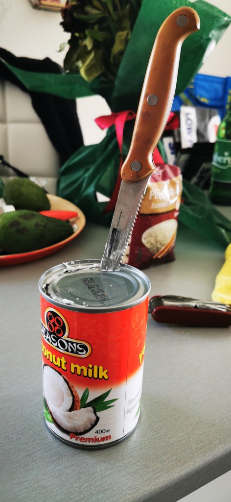 I needed to save this ASAP, so I promptly added the coconut milk. This task proved to be its own challenge, as these particular cans didn’t have those convenient little rings for opening at the top and – surprise! – I don’t own a can opener.