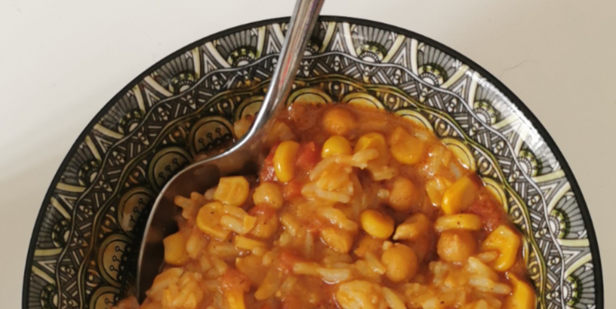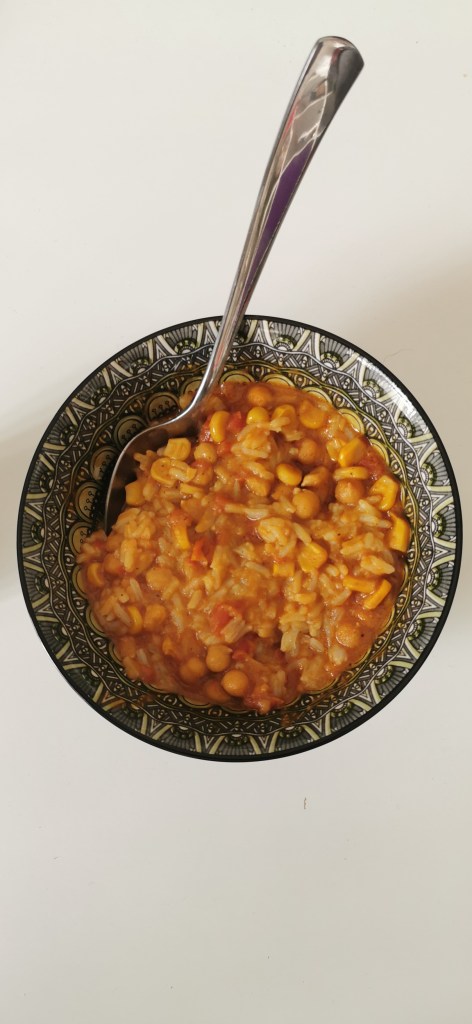 The ordeal was nearing its end. I drained the sweetcorn and tossed that in the pot as well. I added salt – to taste, 2 heaped teaspoons of mild curry powder, and 2 heaped teaspoons of hot curry powder – that way the result was flavourful, but didn’t burn our mouths off.