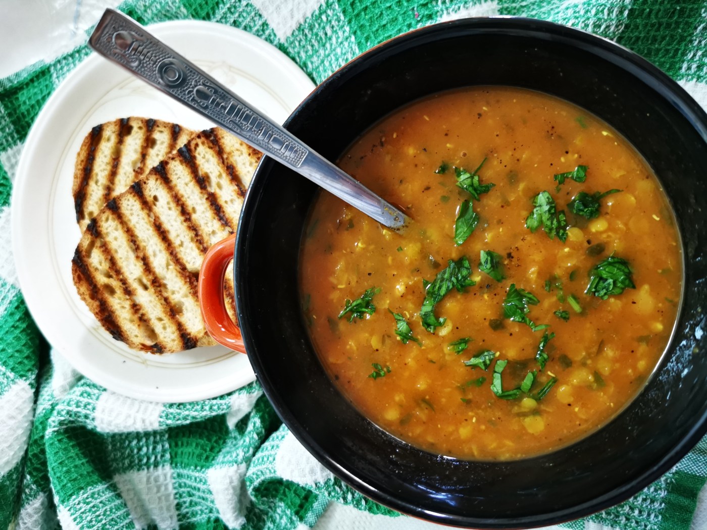 This soup is vegan and perfect for any time of day, and is delicious on its own, but it is nicely complemented by greek yogurt (or sour cream) and croutons.